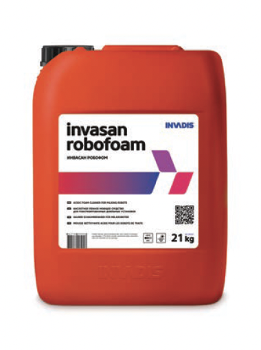 Invasan robofoam – специальное кислотное пенное моющее средство для очистки робото‑доильных установок и прилегающих поверхностей. Продукт эффективно удаляет минеральные отложения и молочный камень, образующиеся при эксплуатации роботов.